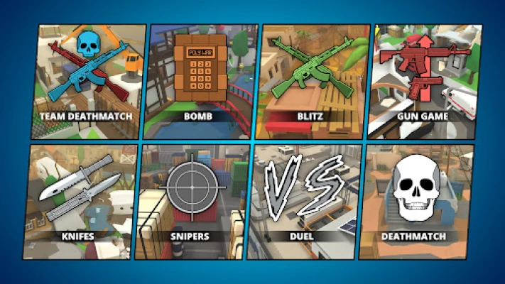 Various maps and game modes — Shooting range, Team mode, Gungame and even Duels: choose a mode to your taste.